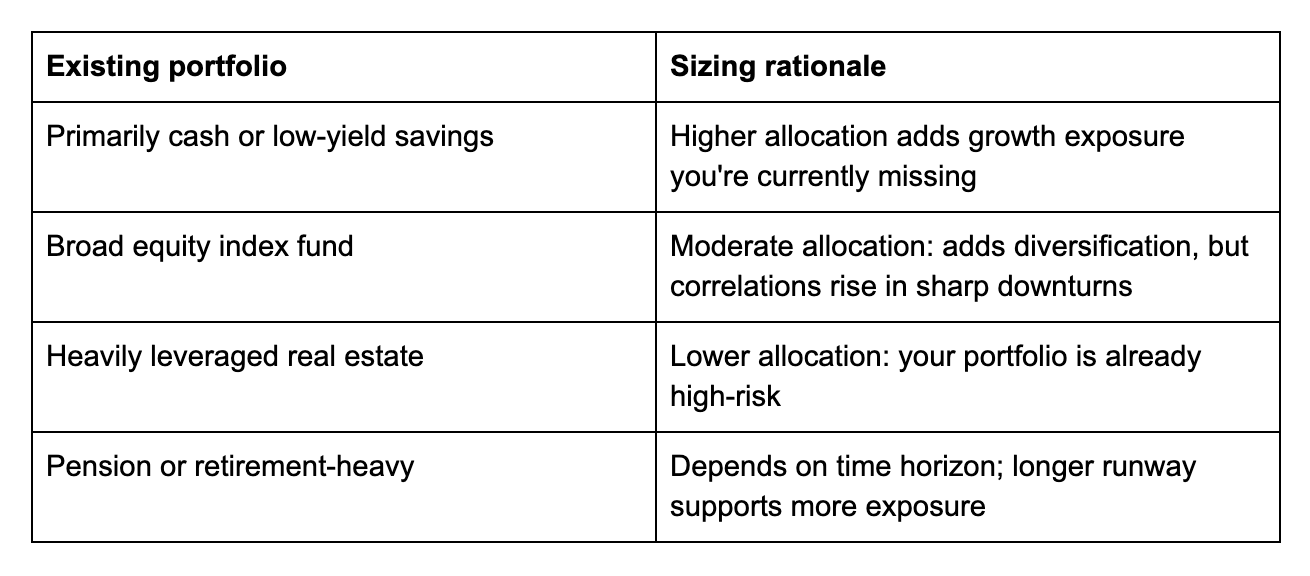 If you have 12 months of living expenses in a bank account and a stable income, you can hold a volatile asset through a significant drawdown without being forced to sell at the worst time. That cushion supports a larger allocation.