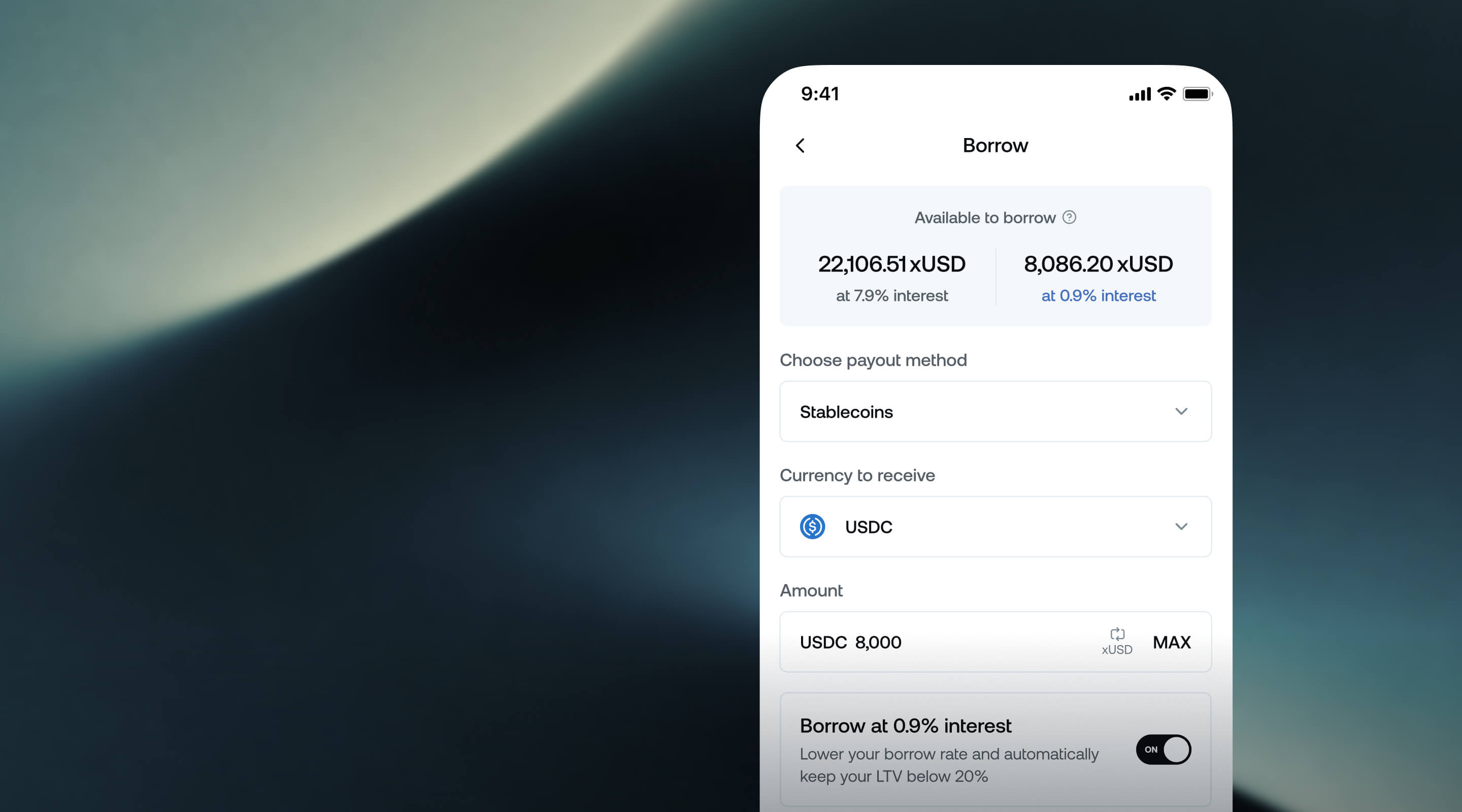 Pick from over 30 supported digital assets to borrow against and view their respective Loan-to-value (LTV) ratio.